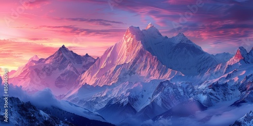 Sunset in the mountains, pastel pinks and purples, snow-capped peaks, high definition, soft light, peaceful and picturesque, panoramic scene, natural wonder