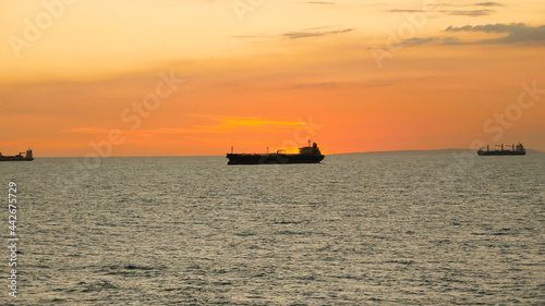 Sunset in the sea with view of tanker vessel on the horizon line