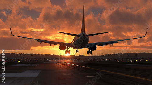 Sunset Landing: Airplane Silhouetted Against a Vibrant Sky on Runway