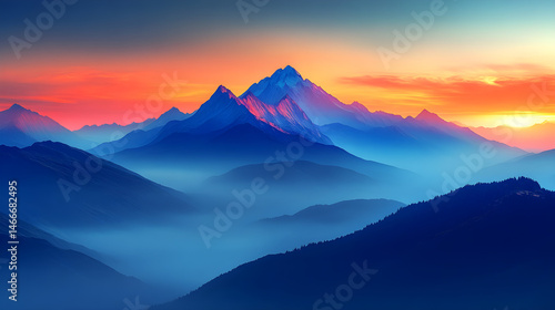 Sunset landscape with blue and orange mountain peaks glowing under soft natural light