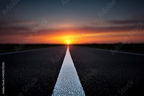 Sunset light hitting center road line in symmetrical dusk composition with long shadow reflections and bold colors depicting solitude in a tranquil scenic highway