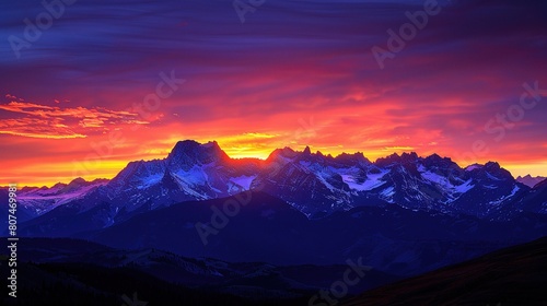 sunset mountainscape, with rugged peaks silhouetted against a fiery sky ablaze with hues of orange