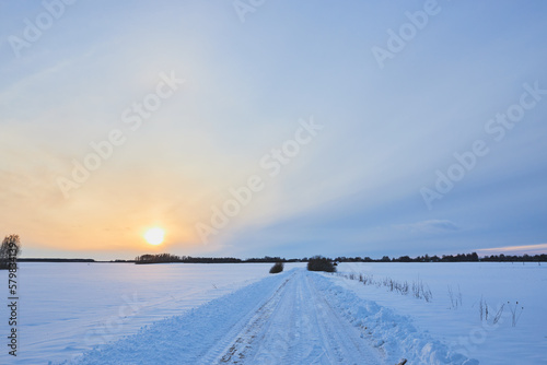 Sunset on a snowy road. Off-road on a snow-covered road.