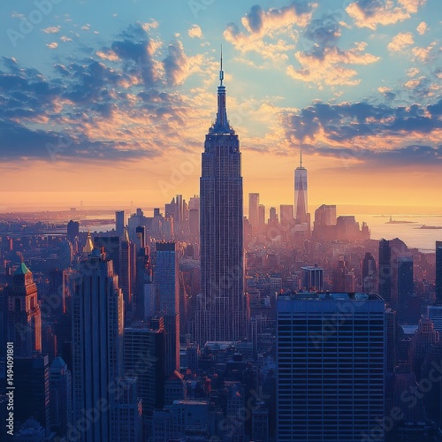 Sunset over a densely packed city skyline with a prominent tall skyscraper in the center surrounded by other high-rise buildings and a partly cloudy sky casting warm light