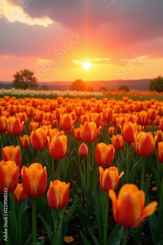 Sunset over a field of bright orange tulips and daffodils, tulips, field, landscape