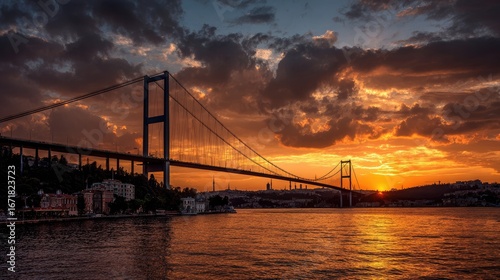 Sunset Over a Majestic Bridge with a Scenic Skyline and Vibrant Cloud Patterns Reflected on Calm Water