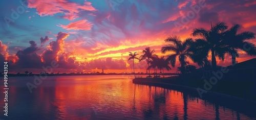 sunset, tropical, lagoon, water, sky, cloud, palm, tree, silhouette, gold, hours, horizon, landscape, nature, beautiful, photo, colours, high-coloured, orange, red, pink, purple, blue, light, ray, warm, bright, vibrant, calm, serene, peaceful, tranquil, paradise, travel, vacation, destination, ocean, sea, coast, shore, beach, island, idylli, dreamy