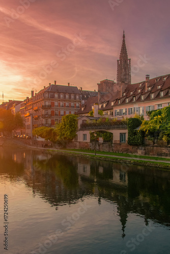Sunset over Cathedral Notre Dame of Strasbourg, Alsace, France