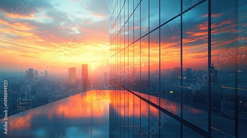 Sunset over city reflected in modern glass skyscraper