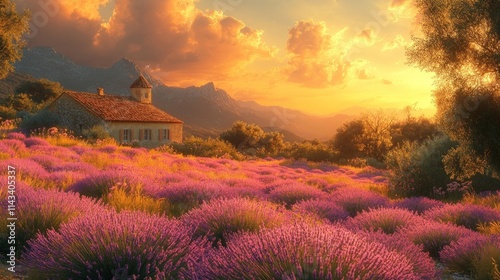 lavandula, field, sunset, house, mountain, cloud, orange, purple, nature, landscape, rural, scenic, idylli, peaceful, tranquil, serene, bungalow, stone, roof, hill, tree, gold, sky, dusk, light, provence, summer, beautiful, picturesque, calm