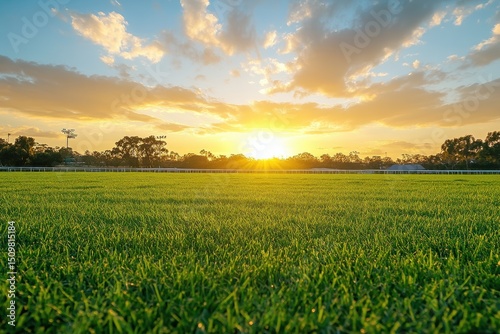 Sunset over lush green horse racing track creating a tranquil atmosphere, Sunset at vacant horse racing track with lush green grass