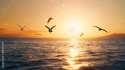 Sunset over the water with birds flying against sunlight on the Mediterranean Sea : Generative AI