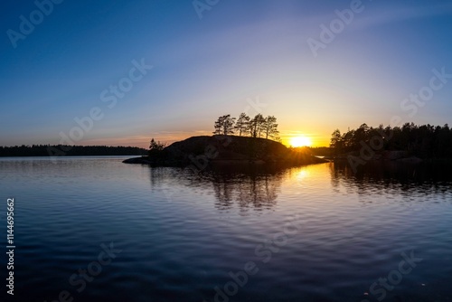 sunset, lake, reflections, tranquil, serene, silhouette, tree, blue skies, water, nature, landscape, peaceful, evening, horizon, dusk, outdoors, scenery, calm, beauty, twilight, natural, environment, wilderness, sky, travel