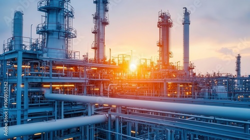 Sunset over vast refinery, fuel technology landscape, industrial beauty