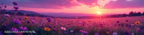 Sunset paints violet & pink hues across blooming wildflowers in a tranquil meadow , outdoor, flowers