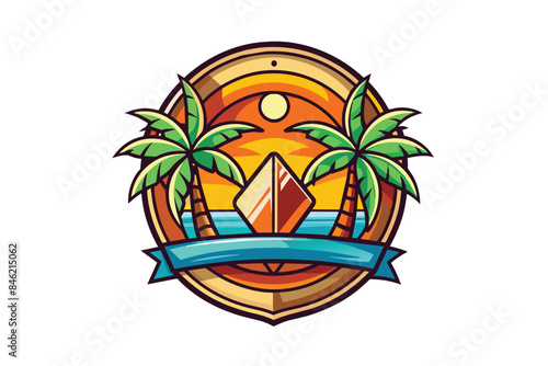 tropical, sunset, palm, tree, beach, badge, vector, illustration, summer, vacation, ocean, paradise, nature, landscape, travel, scenic, design, sea, island, adventure, relaxation, resort, sunny, drawing, graphic, exotic, emblem, colourful, leisure, art, cartoon, fun, holiday, serene, peaceful, beautiful, coastline, get-away, vibrant, tranquil, coastal