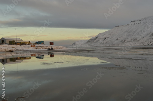 Sunset reflections over the frozen Arctic Norwegian Archepelago of Svalbard, Norway
