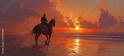 sunset, horseman, beach, ocean, horse, rider, silhouette, equestrian, sky, cloud, water, sand, wave, orange, red, gold, twilight, evening, coast, shoreline, seacoast, landscape, nature, art, painting, digital, illustration, scene, view, image, travel, adventure, serenity, calm, peaceful, solitude, freedom, journey, cowboy, western