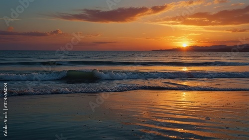 sunset, ocean, sea, beach, wave, water, sky, cloud, horizon, golden hour, sunrise, coastal, landscape, nature, scenery, calmness, peaceful, calm, serene, beautiful, vibrant, colours, orange, yellow, pink, purple, light, sun, evening, dusk, summer, travel, vacation, picturesque, idylli, dramatic, majestic, breathtaking, sandbeach