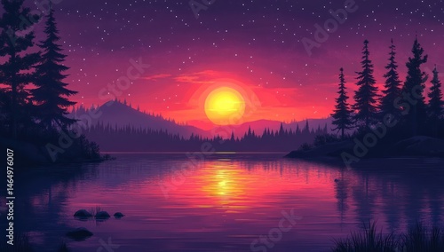 sunset, lake, mountain, forest, tree, pine, coniferous, silhouette, water, sky, star, night, dusk, evening, twilight, calm, serene, peaceful, tranquil, nature, landscape, scenery, beautiful, vibrant, colourful, red, orange, purple, pink, digital artwork, illustration, artwork, graphic, design, wallpaper, background, aesthetic, minimalist, simple, moody, magical