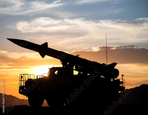 missile, launcher, sunset, vehicle, military, weapon, warfare, army, defense, power, silhouette, orange, sky, cloud, desert, landscape, destruction, threat, conflict, technology