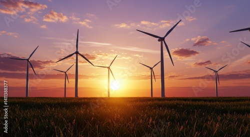 Sunset Silhouette of Wind Turbines in a Serene Meadow: Renewable Energy and Environmental Conservation