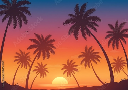 sunset, palm tree, ocean, beach, tropical, silhouette, sky, orange, purple, pink, red, yellow, horizon, summer, vacation, nature, scene, landscape, calm, serene, peaceful, evening, twilight, relaxing, vibrant