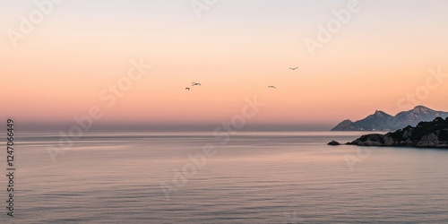 Sunset sunrise scene of the sea with pink sky. Sky sea and bird silhouette with mountain horizon background wallpaper