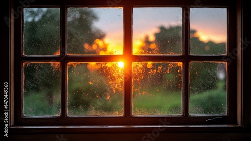 Sunset Through Paned Window: Warm sunset light shines through a rustic, multi-paned window, casting a golden glow on the surrounding landscape.
