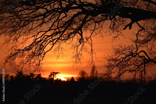 Sunset through the oak tree branches, spring, Coombe Abbey, Coventry, England, UK
