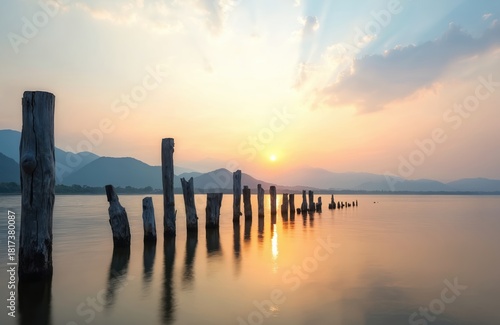 Sunset view over calm lake with weathered wooden poles. Mountains are on background. Dramatic sky with golden sun light. Beautiful nature landscape.