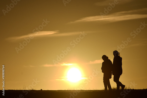 2, people, walk, walking, sunset, sun, gold, couple, pair