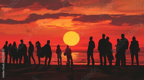 silhouette, sunset, people, family, sky, sun, group, nature, beach, couple, woman, children, sunrise, walking, summer, vector, man, landscape, love, illustration, team, orange, business, mother, sea