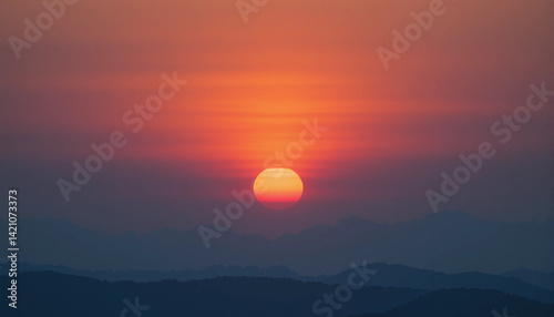 Sunset's Crimson Embrace: An evocative scene of a radiant sunset, with its fiery hues painting the sky as it dips below the horizon over silhouetted mountain.