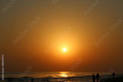 Sunset's Glow, Painting the Sky with Golden Hues above the Sea, The sunset above the sea, Sunset on the beach, beach, sunset, people