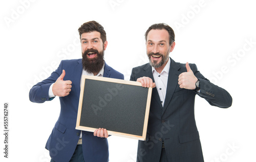Super offer. Happy men give thumbs ups holding blackboard. Gesturing thumbs ups. Thumbs ups. Hand signs. Thumbs ups for approval. Board to promote commercial products, copy space