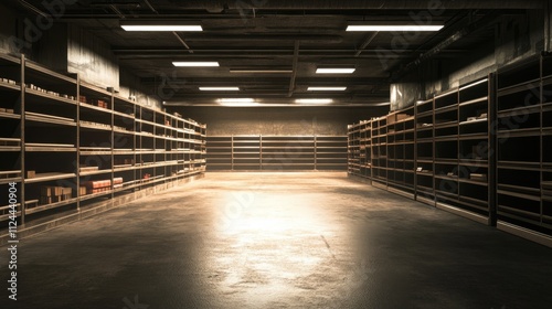 Supermarket interior with completely barren shelves and bright, industrial lighting
