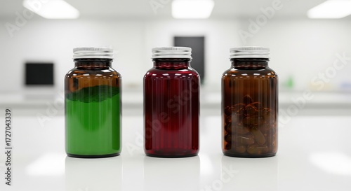 bottle, supplement, medicine, capsule, powder, liquid, pharmaceutical, laboratory, health, vitamin, health care, wellness, science, nourishment, research, container, glasses, jar, pill, drug, treatment, pharmacy, green, red, assortment, clinical, product, nobody