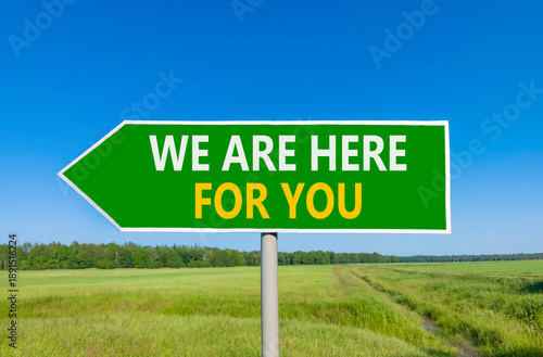 Support, help and we are here for you symbol. Concept words We are here for you on beautiful green road sign. Beautiful blue sky field background. Business we are here for you concept. Copy space.