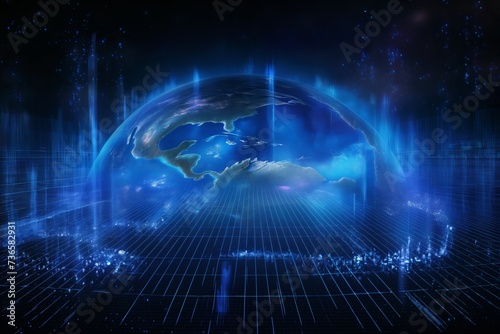 surface of earth planet with futuristic computer technology and mega city, digital connections with hologram and glow against background of space, concept of globalization and urbanization