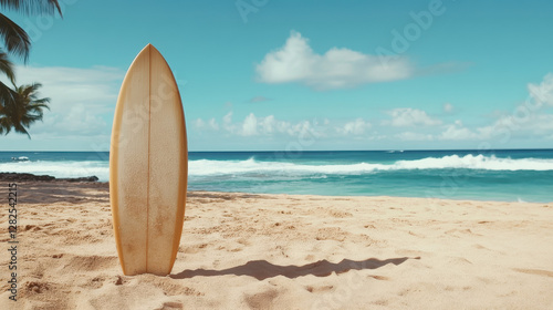 surfboard, beach, sand, ocean, wave, shore, summer, vacation, sunlight, travel, relaxation, nature, coastline, surf, warm, horizon, tropical, paradise, leisure, water, sunshine, blue, calmness, adventure, non-urban, seascape, landscape, beauty, activity, vacation spot, surfing, board, design, culture