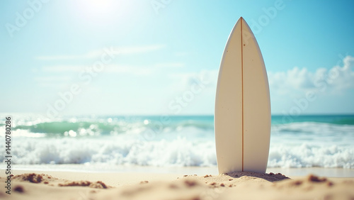 surfboard, beach, ocean, wave, sand, sky, blue, white, clear sky, sandbeach, upright, shore, seacoast, coast, coastal, water, daytime, sunny, sunshine, horizon, sea, surf, foam, cloud, cloudy sky, water, turquoise water, tan, brown, texture, no people, summer, tropical, vacation, holiday, recreation, sport, leisure, tranquil, peaceful, serene, nature, seascape