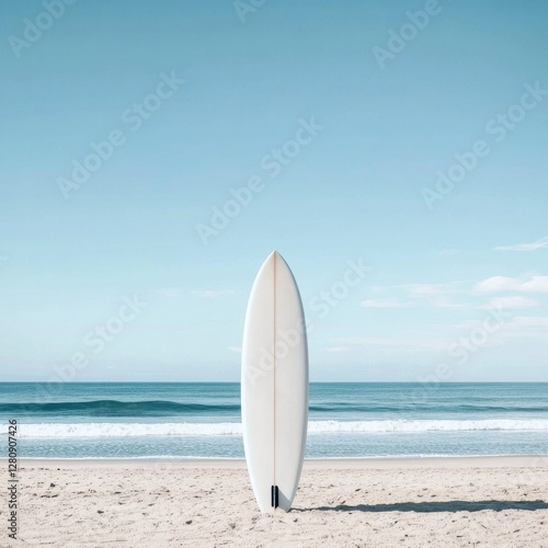 Surfboard Standing Vertically on Sandy Beach with Azure Ocean and Blue Sky