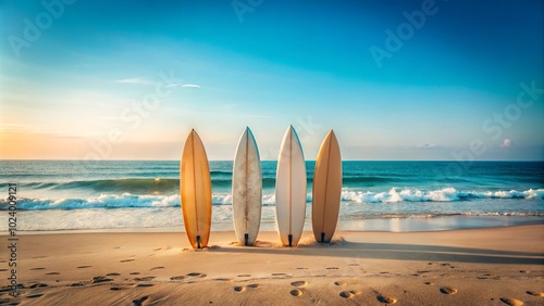 Surfboards stand in a row on a sandy beach, waiting for the next wave to break. The sun shines brightly in the blue sky, casting a warm glow on the water and the sand.