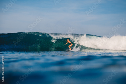 Surfer girl at surfboard and blue wave.