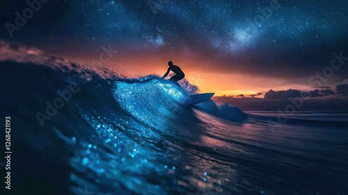 surfer, wave, ocean, sunset, night, star, bioluminescence, surfing, water, sport, adventure, travel, night sky, sky, sea, man, board, extreme, nature, summer, dusk, darkness, glow, light, energy, freedom, active, lifestyle, peaceful, calm, vibrant, beautiful, powerful, majestic, amazing, incredible, spectacular, awesome, marvellously, fantastic