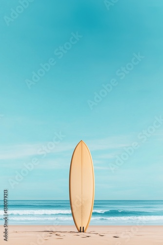 surfboard, beach, ocean, wave, sand, surf, shore, water, sky, sun, tranquil, horizon, summer, activity, coastline, sport, recreation, vacation, leisure, nature, adventure, blue skies, relaxation, sunlight, travel, sandy shore, marin, summer day, coastal, sunny day, peaceful