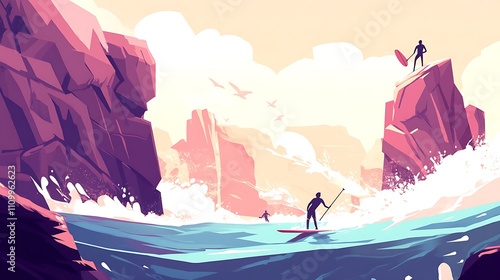 surfing, paddle, ocean, rock, wave, adventure, sunset, sport, water, activity, nature, exploration, adrenalin, leisure, outdoors, fitness, sea, horizon, movement, fun, thrill, scenery, coastline, people, skill, balance, challenge, environment, travel, landscape, freedom, summer, splash, energy, calmness, excitement, beauty, surfboard, sky, cloud, wildlife, aquatic, recreation, surf, athleticism