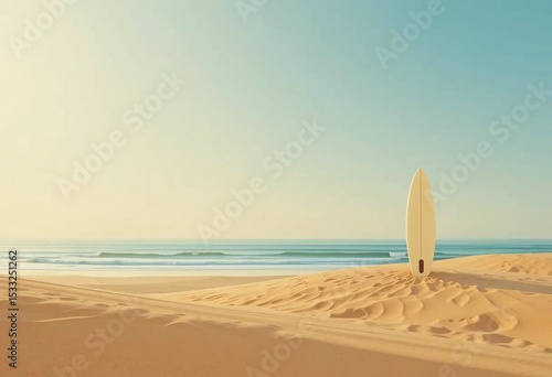 Surfing day at the beach with a surfboard resting on the sandy shore under a clear blue sky during golden hour