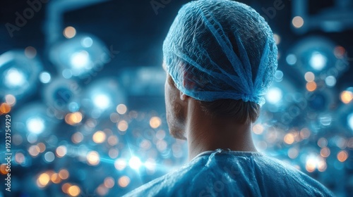 surgeon, male, operating room, medicals, health care, sterile, instrument, lighting, hospital, backview, professional, surgery, preparation, clinical, focused, observation, standing, indoor, equipment, blue color, medical professional, medical equipment